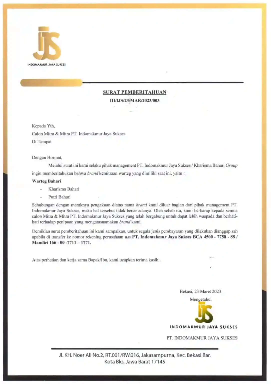 Warteg Subsidi Bahari tidak mengambil sepeserpun dari penghasilan outlet mitra! Seluruh keuntungan yang mitra dapatkan akan sepenuhnya menjadi hak milik mitra jadi mitra tidak perlu khawatir akan terpotong biaya royalti dari profit outlet.